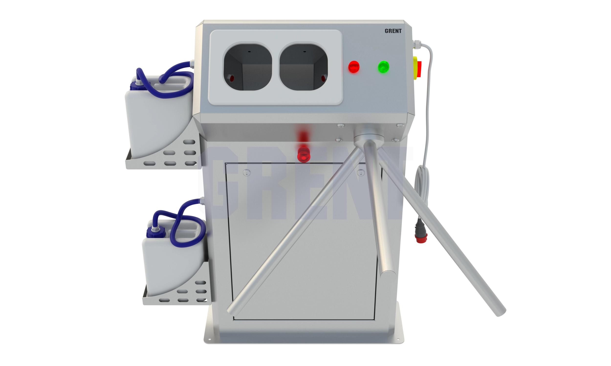 Станция гигиены рук GRENT 012 R предназначена для автоматической бесконтактной дезинфекции кистей рук персонала перед входом в чистую зону. Включение подачи дезинфицирующего средства происходит при поднесении обеих рук в зону срабатывания фотоэлементов, расположенных в дезинфицирующей камере. Дезинфицирующее средство подается автоматически при помощи электронасоса. Распыление дезсредства осуществляют 4 форсунки, расположенные в верхней и нижней части дезинфицирующей камеры, что обеспечивает обработку рук с двух сторон